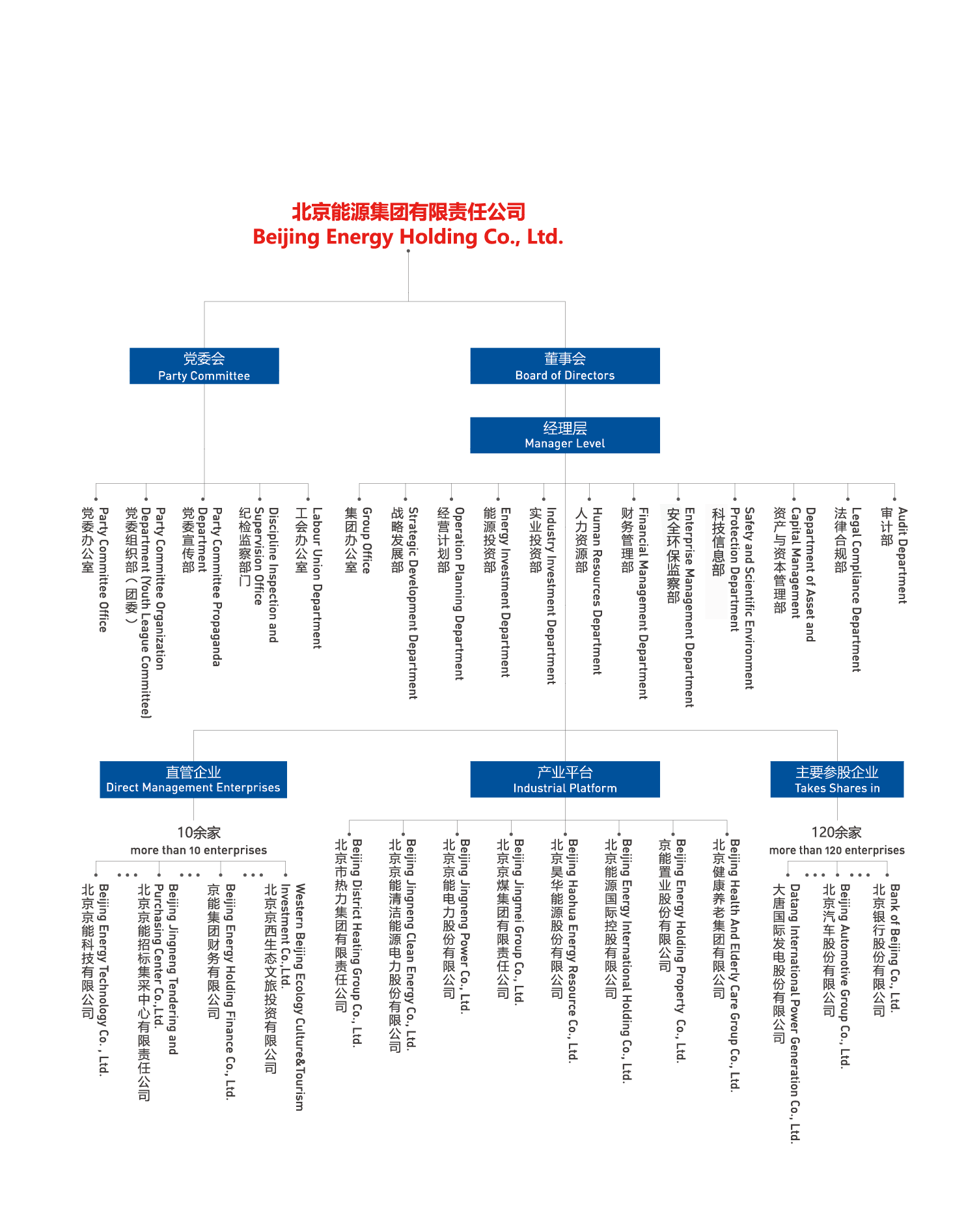 北京能源集團(tuán)有限責(zé)任公司(以下簡(jiǎn)稱“京能集團(tuán)”或“集團(tuán)”)是北京市人民政府出資設(shè)立的國(guó)有獨(dú)資公司,肩負(fù)著保障首都北京能源安全可靠供應(yīng)的重任。集團(tuán)成立于2004年,由原北京國(guó)際電力開(kāi)發(fā)投資公司和原北京市綜合投資公司合并而成,2011年、2014年先后又與北京市熱力集團(tuán)有限責(zé)任公司、北京京煤集團(tuán)有限責(zé)任公司實(shí)施合并重組,實(shí)現(xiàn)了產(chǎn)業(yè)鏈條融合互補(bǔ)。經(jīng)過(guò)多年的資源整合,集團(tuán)由單一能源產(chǎn)業(yè)發(fā)展為熱力、電力、煤炭、健康文旅等多業(yè)態(tài)產(chǎn)業(yè)格局。2024年底,集團(tuán)資產(chǎn)規(guī)模達(dá)4934億元,年?duì)I業(yè)收入975億元,全資及控股企業(yè)860余家,參股企業(yè)120余家,擁有員工3.4萬(wàn)余人,投資區(qū)域遍布全國(guó)33個(gè)省市區(qū)以及海外,控股京能清潔能源、京能電力、昊華能源、京能置業(yè)、北京能源國(guó)際、京能熱力六家上市公司,盈利水平長(zhǎng)期穩(wěn)居北京市屬企業(yè)前列。2024年在中國(guó)企業(yè)500強(qiáng)排名第247位,中國(guó)服務(wù)企業(yè)500強(qiáng)排名第87位。